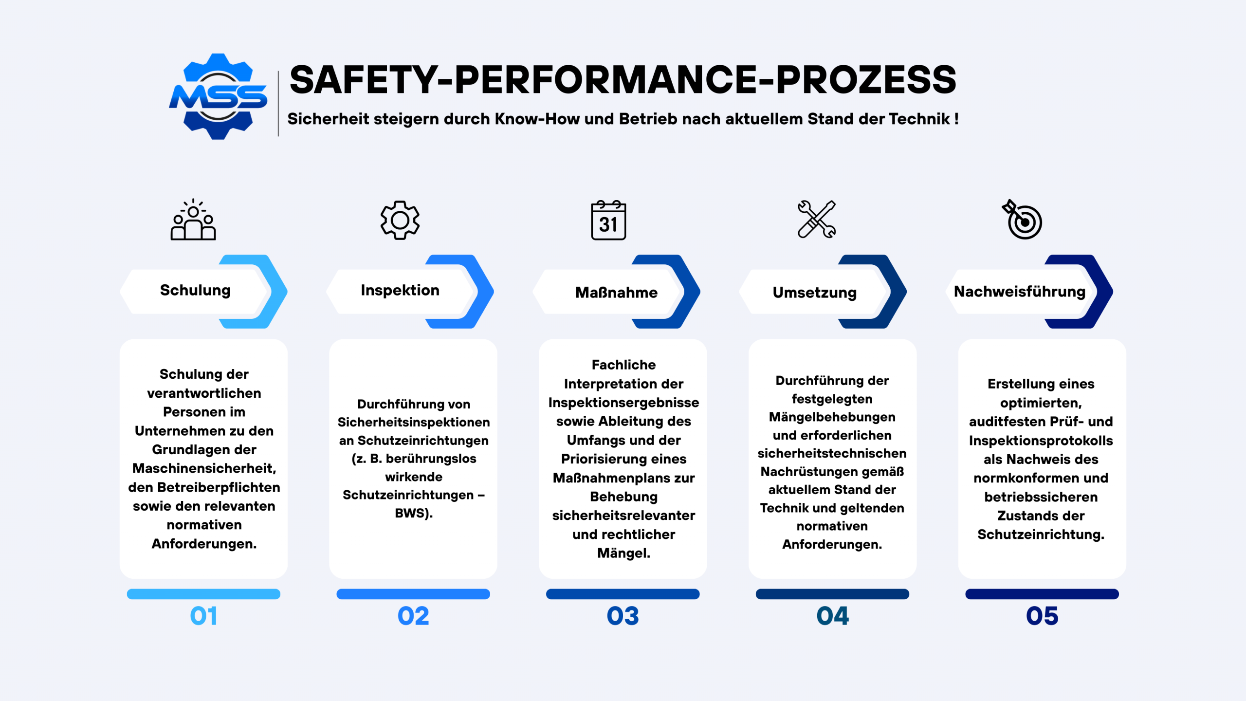 Die MSS Machine Safety Services GmbH ist ein dynamisches Unternehmen am Puls der Zeit, spezialisiert auf Maschinensicherheit mit besonderem Fokus auf Prüfdienstleistungen. Ergänzt wird unser Portfolio durch sicherheitstechnische Beratung, Applikationssupport und maßgeschneiderte Safety Lösungen. Damit schaffen wir Sicherheit und reibungslose Abläufe – stets auf Basis des aktuellen Stands der Technik und im Einklang mit den Anforderungen des Industrie-4.0-Zeitalters.